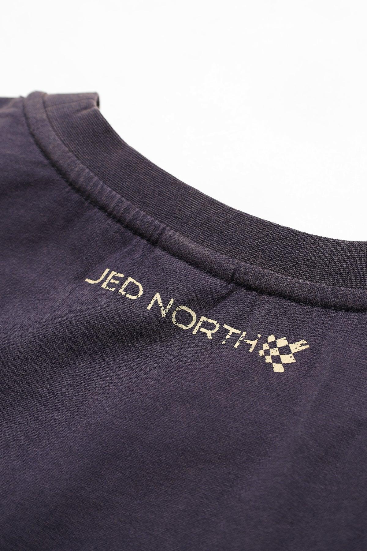 • Stitched logo under left arm sleeve and back distressed classic Jed North logo